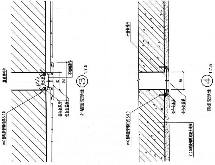 (3)要求以镀锌钢板、木砖、沥青麻丝或软质聚苯乙烯泡沫塑料作详图③外墙面变形缝(本题以国标新材料为依据进行变形缝设计,考生考试应以规定材料设计)。