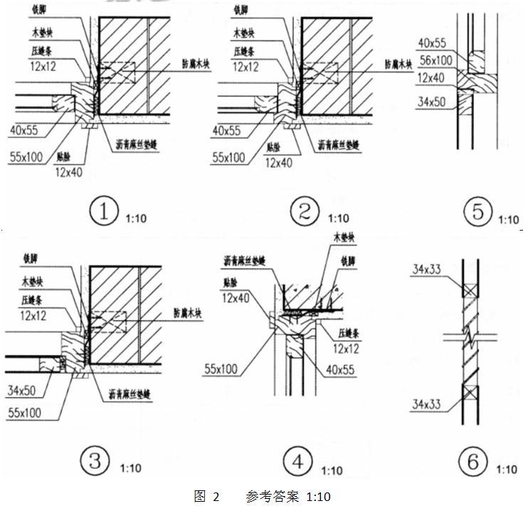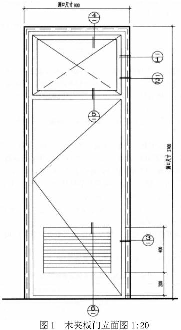 图示木夹板门(如下图1)按指定的剖面线位置及剖视方向,绘出构造节点详图,包括与240mm砖墙及过梁的关系,要求构造合理。