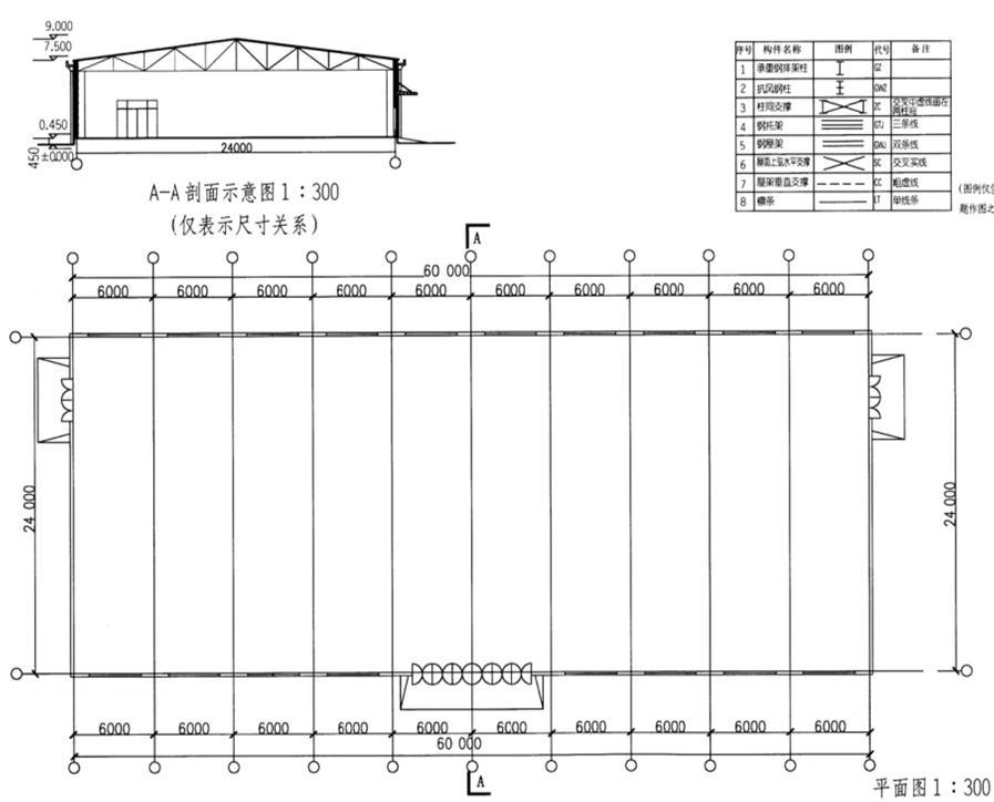 3.檩条为槽钢,跨度为3000mm、3600mm、6000mm、6600mm。檩距水平投影为3000mm。4.屋面采用压型钢板。