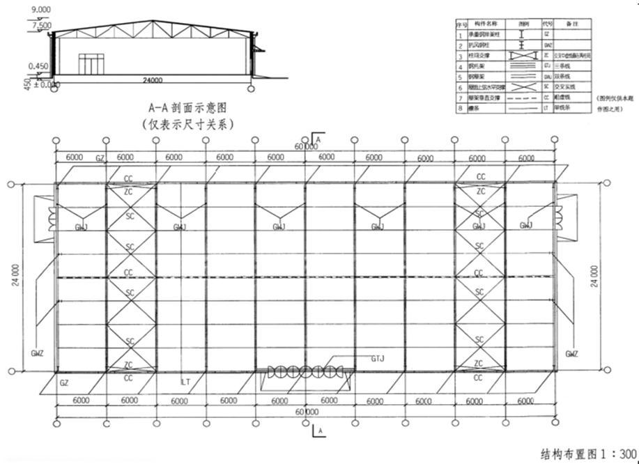2.屋面结构采用平面桁架,形式见A-A剖面示意图。