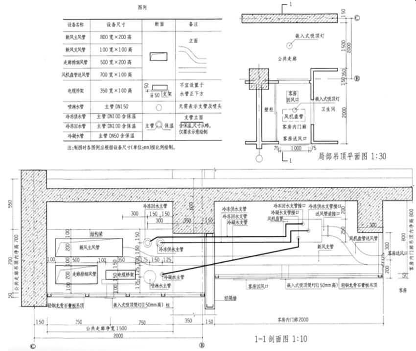1.在1-1剖面图单面公共走廊吊顶内按比例布置新风主风管、走廊排烟风管、电缆桥架、喷淋水主管、冷冻供水主管、冷凝水主管,并标注前述设备名称、间距。