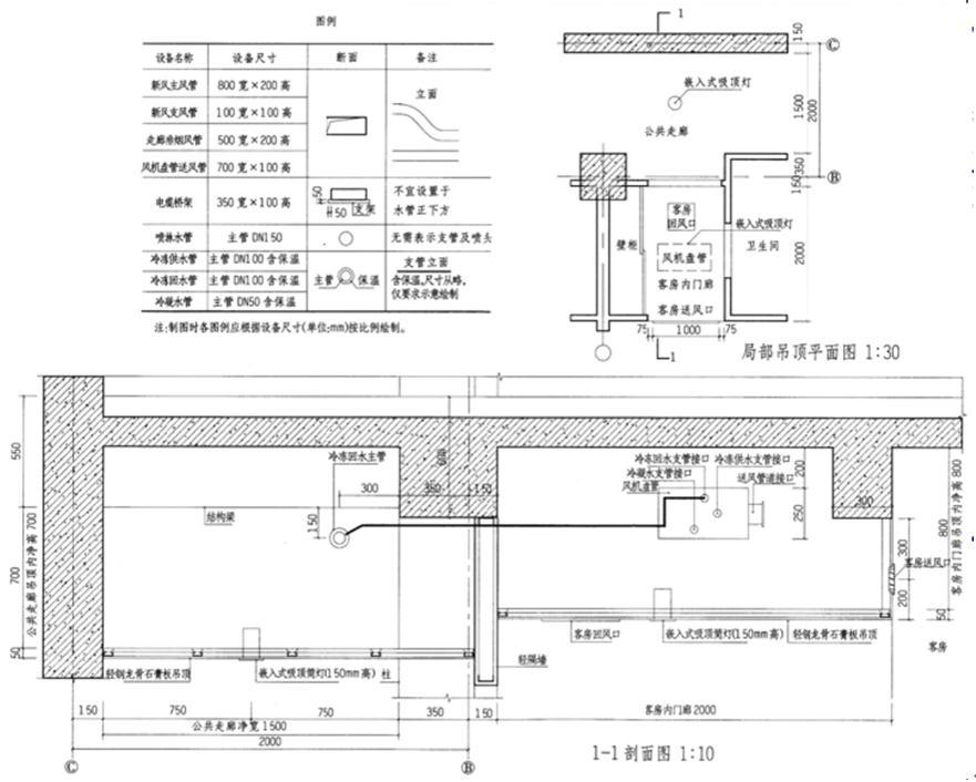 某宾馆单面公共走廊、客房内门廊的局部吊顶平面如图,客房采用常规卧式风机盘管加新风的供冷空调系统。要求在1-1剖面图中按照提供的图例进行合理的管线综合布置。