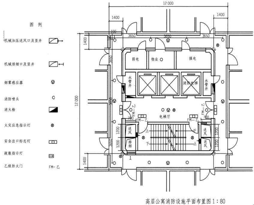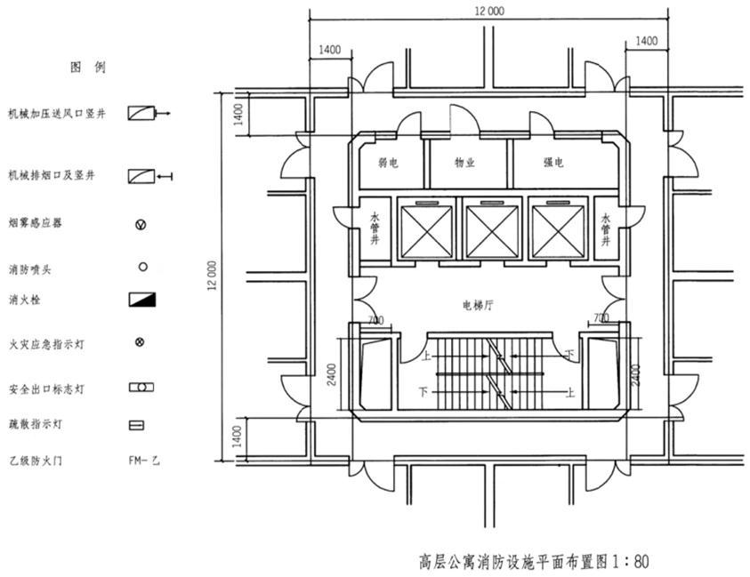 下页图为24层高级公寓标准层(建筑面积1450㎡)的核心筒及走廊平面图。在图中进行消防设施的布置,在考虑建筑美观的前提下,要求布置消防设施形式最少最合理,钢筋混凝土墙上可开洞。