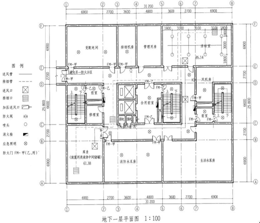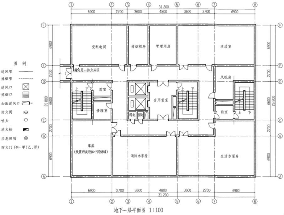 在平面图中,根据给出的图例,按以下要求完成相关设备的布置。1.标注图中防火门(甲、乙、丙级)。2.按照给定的平面功能合理布置地下一层消防送风、防烟、排烟口的设置,风管采用图示单