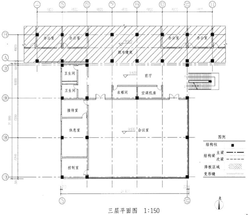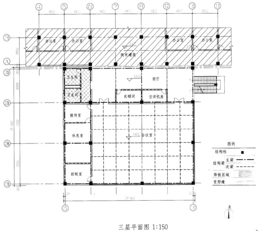 图中阴影部分为抗震设防烈度6度地区的既有多层办公楼局部,现需在其南向增建三层钢筋混凝土结构的会议中心。在经济合理的前提下,按照设计条件、任务要求及图例,在图上完成增建建筑三层楼面的结构布置。