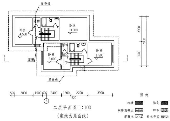 层高:一层3000mm,二层2400mm(楼面至外墙中轴线与屋面结构板面的交点)。