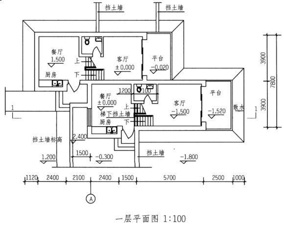 结构类型:砖墙体承重,现浇钢筋混凝土楼板。室内外高差:详见图示。