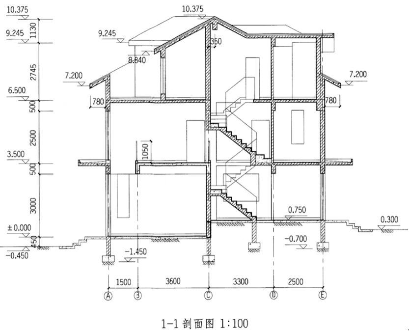 根据所给某坡地住宅各层平面图及屋顶平面图,按指定的剖切线位置画出剖面图。剖面图应正确反映出平面图所表示尺寸及空间关系,并应符合构造要求。