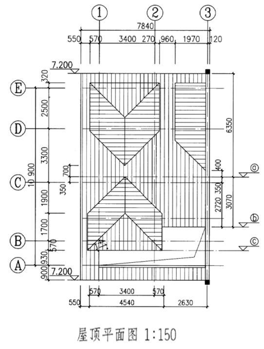 屋面:二坡顶或三坡顶,屋面坡度1:2。100mm厚现浇混凝土斜屋面板,20mm厚水泥砂浆找平层,2mm厚防水涂膜,粘贴防水卷材,上贴25mm厚聚苯乙烯保温隔热板,40mm厚细石混凝土找平层,内配φ6@500mm×500mm钢筋网,随贴瓦楞形面砖,挑檐自由落水。