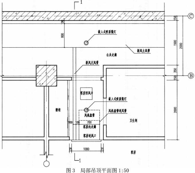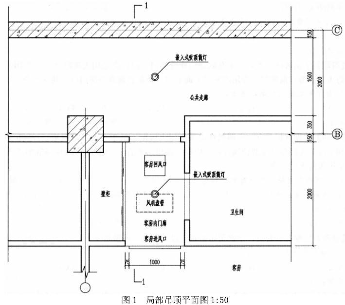 图1为某旅馆单面公共走廊、客房内门廊的局部吊顶平面图,客房采用常规卧式风机盘管加新风的供冷暖空调系统。要求在图21-1剖面图中按照提供的图例进行合理的管线综合布置。