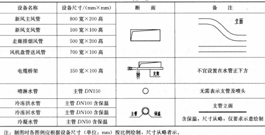 (1)在1-1剖面图单面公共走廊吊顶内按比例布置新风主风管、走廊排烟风管、电缆桥架、喷淋水主管、冷冻供水主管、冷凝水主管,并标注前述设备名称、间距。