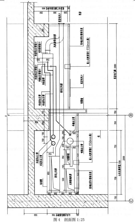 (2)在1-1剖面图客房内门廊吊顶内按比例布置新风支风管、风机盘管送风管、冷冻供水支管、冷凝水支管,表示前述设备与公共走廊吊顶内设备以及客房送风口的连接关系,并注出名称。