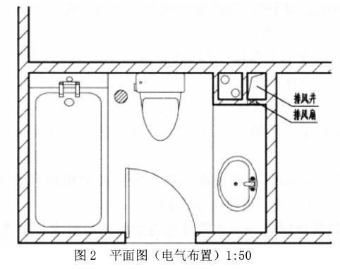 2)布置排风扇插座(开关布置在门外)、坐便器加热器插座、电吹风插座各一个,并绘制其连线。