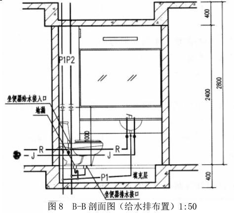 4)污水(粪便)排水管布置(与立管接口在填充层内)。