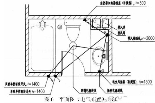 3)在电气布置平面图中,标明单联单控暗装开关和电吹风插座的名称及安装高度。