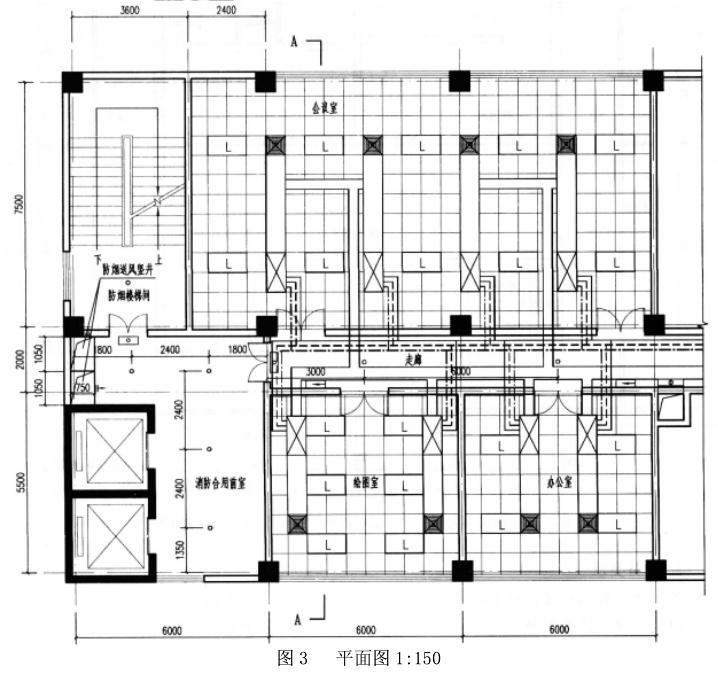 (2)空调部分:采用风机盘管加新风的空调系统:会议室采用4个风机盘管,其他房间2个风机盘管(空调的供水管、回水管及凝结水管由走廊的东面接入)。在应设加压送风防烟的部位画出防烟送风口及送风竖井。每个送风竖井面积不小于0.75㎡。