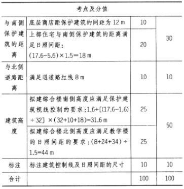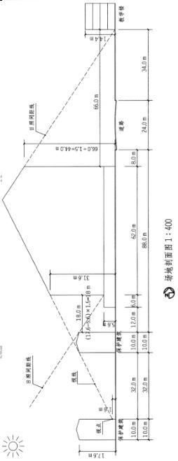 设计条件 1.某场地南侧有两栋保护建筑,北侧为教学楼,拟在保护建筑和教学楼之间建一栋综合楼,一层为商店,层高5.6m,二层以上均为住宅。保护建筑和教学楼位置、高度如图所示。 2.在两栋保护建筑之间任何一点,视高在1.6m的情况下,拟建综合楼不能有视线遮挡。 3.拟建综合楼距保护建筑不小于12m。 4.拟建综合楼退道路红线8m。 5.当地日照间距系数为1.5。