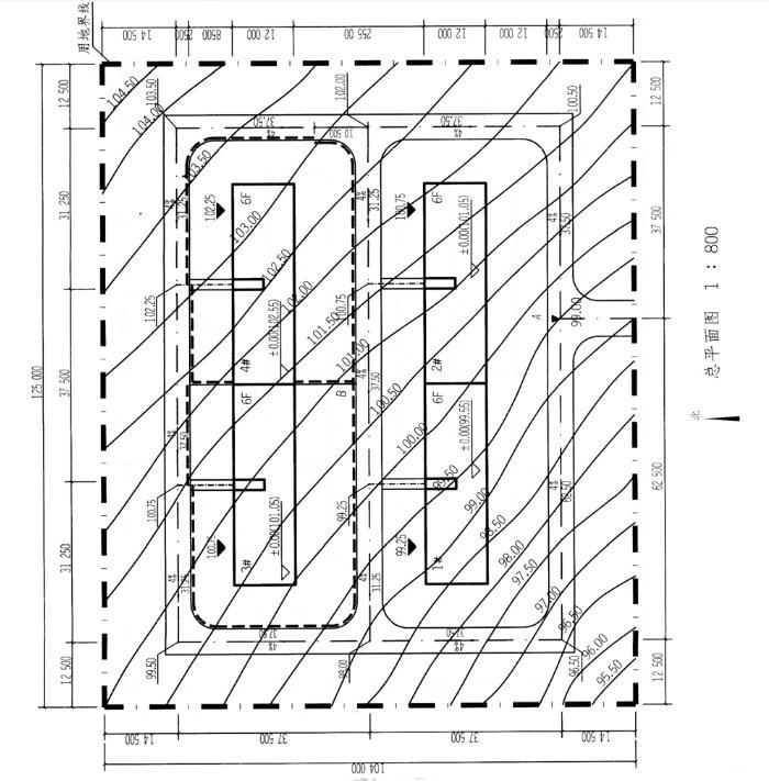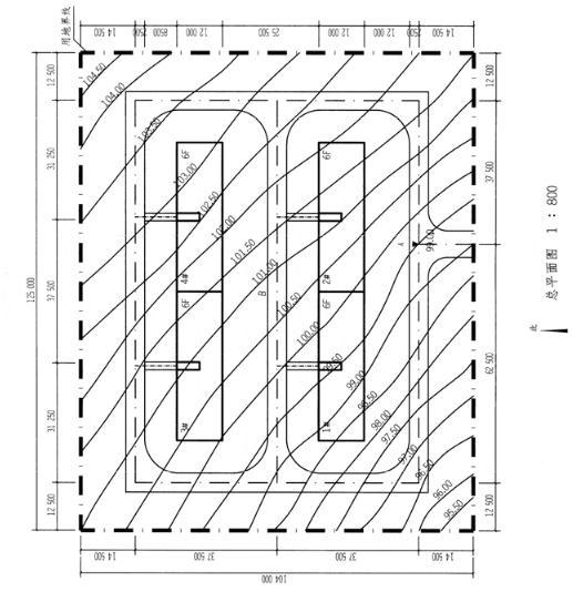 设计条件 1.某坡地上拟建多层住宅,建筑、道路及场地地形如图所示。 2.住宅均为六层,高度均为18.00m,当地日照间距系数为1.5。 3.每个住宅单元均建在各自高 程的场地平台上,单元场地平台之间高差需采用挡土墙处理, 场地平台、住宅单元入口引路与道路交叉点需相同标高,建筑室内外高差为0.30m。 4.车行道坡度为4.0%,本题不考虑场地与道路的排水关系。 5.场地竖向设计应顺应自然地形。