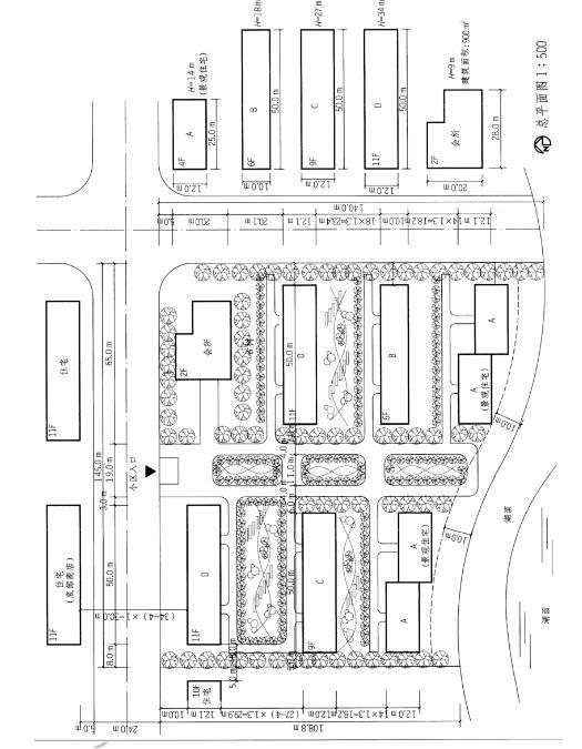 1.某小区用地,总用地面积为1.8公顷,拟建A、B、C、D四种类型住宅单体以及会所,小区用地尺寸及建筑单体尺寸如图所示。