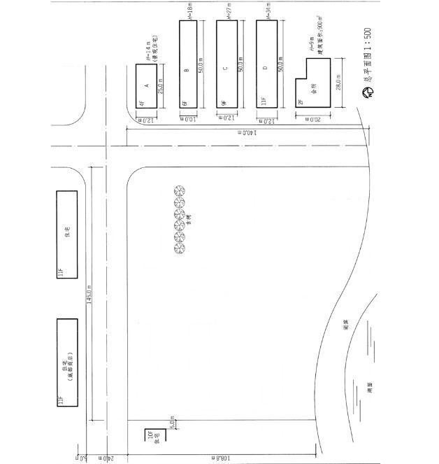 解题要点 1.根据日照间距系数布置住宅单体。 2.尽可能布置9层或11层住宅,以增大容积率。 3.场地出入口设于北侧。 作图提示 1.根据场地条件,首先布置会所的位置,设于场地东北角。 2.场地西北角应设置11F,由于北侧有道路,道路北侧住宅底部还有一层商店,距道路北侧较远,且底部设商业。 3.西北角11F西侧与旁边住宅间距为13m。 4.西北角11F南侧分别设置9F住宅以及4F住宅,并有一栋为景观建筑。 5.会所南侧分别为11F、6F、4F住宅,4F住宅中有一栋为景观建筑。 6.东侧建筑距道路红线8m。 7.场地出入口设于北侧。 8.容积率=(4A+B+C+2D+900)÷18000 =(4×25×12×4+50×10×6+50×12×9+2×50×12×11+900)÷18000 =27300÷18000≈1.52
