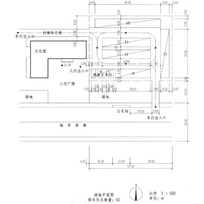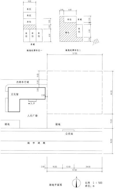 1.某文化馆(建筑耐火等级二级)拟建机动车停车场,场地平面如图所示。
