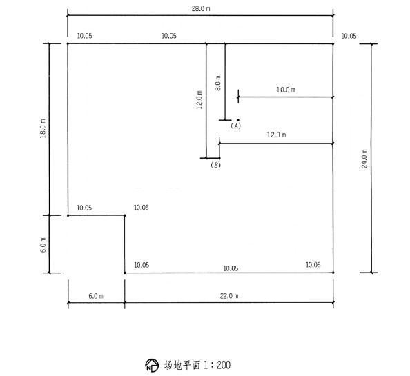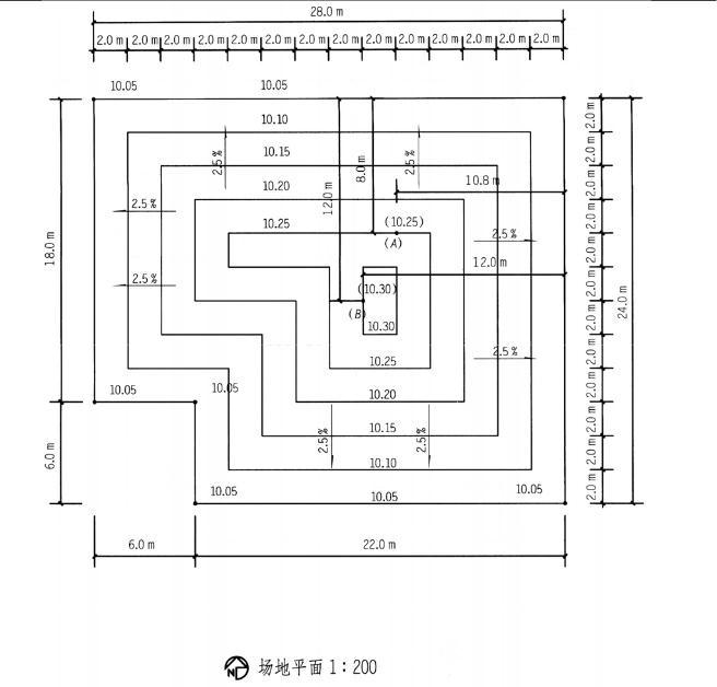 设计条件 已知某场地的标高为10.05,平面尺寸28m×24m,西南角缺一块6m×6m,呈L形的平面。图中设有A点、B点。