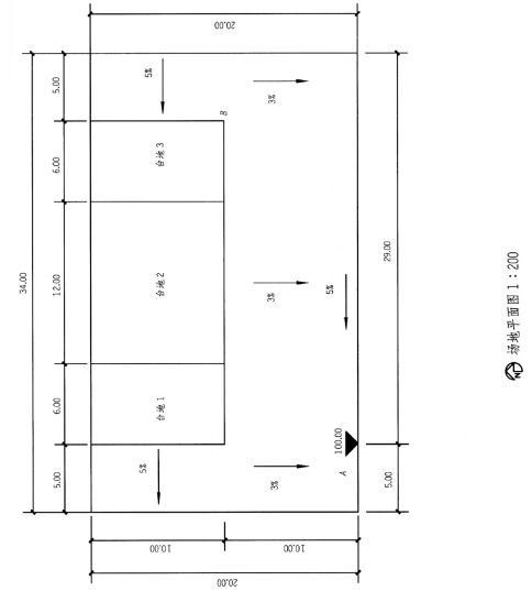 <p>设计条件 1.某坡地上已平整出三块台地,如图所示,试卷比例1:200。 2.每块台地均高于相邻坡地,台地与相邻坡地的最