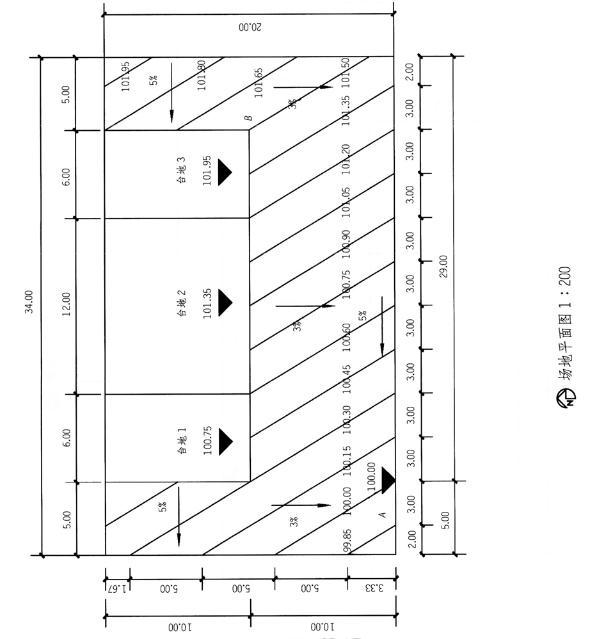 设计条件 1.某坡地上已平整出三块台地,如图所示,试卷比例1:200。 2.每块台地均高于相邻坡地,台地与相邻坡地的最小高差为0.15m。