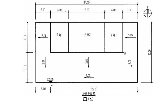 <p>设计条件: ·某坡地上已平整出三块台地,如图(a)所示。 ·每块台地均高于相邻坡地,台地与相邻坡地的最小高差为0.15