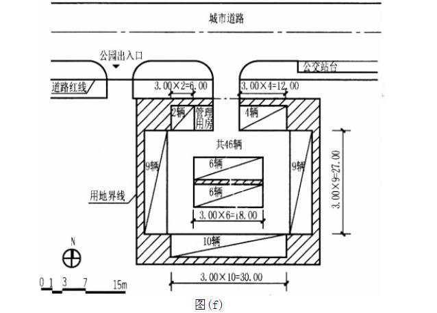 管理用房应布置在停车场出入口附近,方便管理人员管理和收费。本题可将其布置于停车场的南侧出入口旁边。管理用房尺寸为 6m×5m,如图(e)所示。