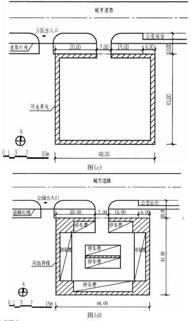 根据规范,基地机动车出入口位置距公园、学校、儿童及残疾人使用建筑的出入口不应小于20m;距地铁出入口、公共交通站台边缘不应小于15m。停车场出入口尺寸为 7m,所以本题停车场出入口只能设在场地北侧中央,距离用地西侧界限 20m 的位置,如图(c)所示。