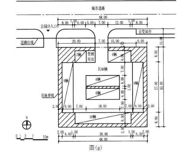 6.标注相关尺寸、出入口位置及停车带停车数量及停车总数(图 g)