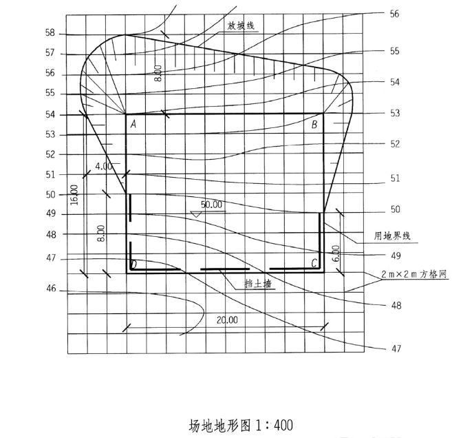 设计条件 1.如图,拟在某自然坡地内平整出大小为16m×20m的场地一块,场地内标高为50m。 2.高于场地部分拟设置1:1放坡,低于场地部分采用挡土墙。