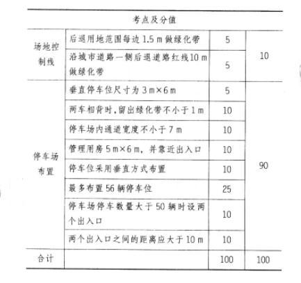 设计条件 1.在城市道路一侧空地布置小型汽车停车场,位置如图所示。 2.在进行停车场布置时应满足如下条件: (1)在用地范围内尽可能多布置停车位(不考虑残疾人停车位),停车位大小及布置要求见下页图。 (2)停车场行车道需贯通布置且宽度不小于7m。 (3)停车场出入口需设5m×6m大小管理用房一幢。 (4)两车相背时,留出绿化带不小于1m。 (5)用地范围后退用地界限1.5m做绿化带,沿城市道路一侧需后退道路红线10m做绿化带。