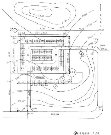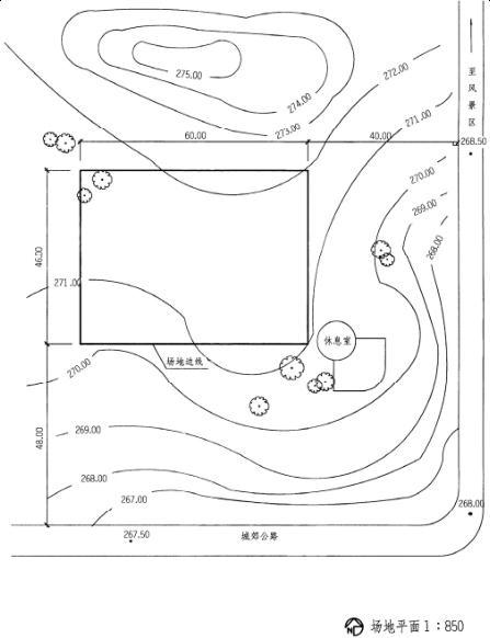 3.停车场地面标高为271.5m,出入口与公路衔接的坡道其坡度应不大于10%。