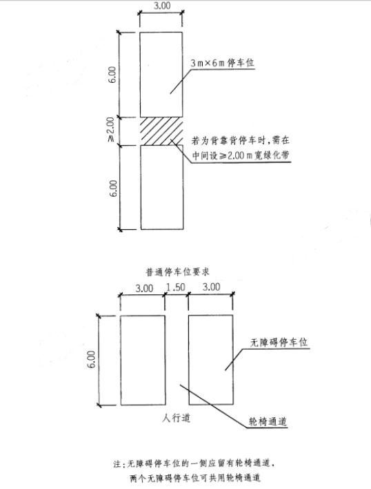 2.要求停车位不少于52个,其中无障碍停车位不少于4个。停车位长度尺寸及要求详见右图,停车场道宽不小于7m,要求车道在场地内贯通,并且采用垂直方式布置停车位。