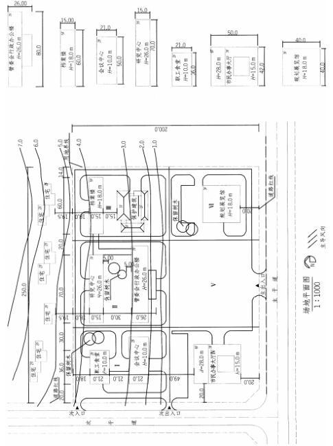 5.各建筑物均为正南北向布置,平面形状及尺寸不得变动。