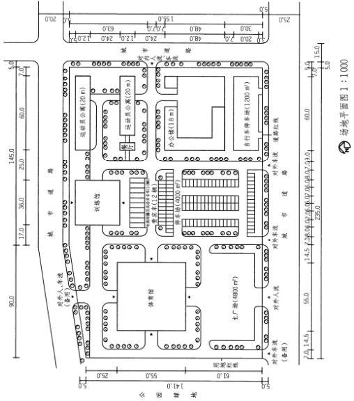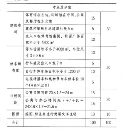 设计条件 1.某市体育场总平面图如图所示,其西侧为公园,南侧、东侧及北侧均为城市道路,且东侧已有出入口和内部道路通至已建办公楼(高18m)。 2.城市规划要求建筑物退后道路红线5m。当地日照间距系数为1.2。 3.欲在用地内新建体育馆、训练馆、餐厅各一栋,以及运动员公寓两栋(高20m)。各建筑平面形状及尺寸如图所示。 4.当地日照间距系数1.2。