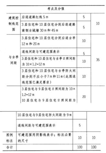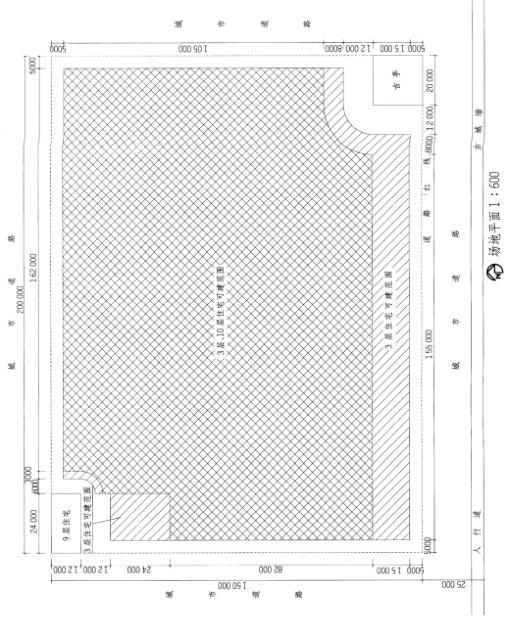 1.某开发商有一已征建设用地,拟建3层和10层住宅。用地西北角已建一幢9层住宅,长×宽=24m×12m,耐火等级为二级;用地东南角有一需保留的古亭,长×宽=20m×20m,高10m,耐火等级为三级;用地南侧隔城市道路有一古城墙,其余三侧也紧临城市道路。具体条件如图所示。