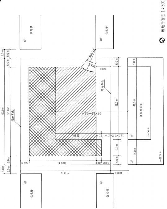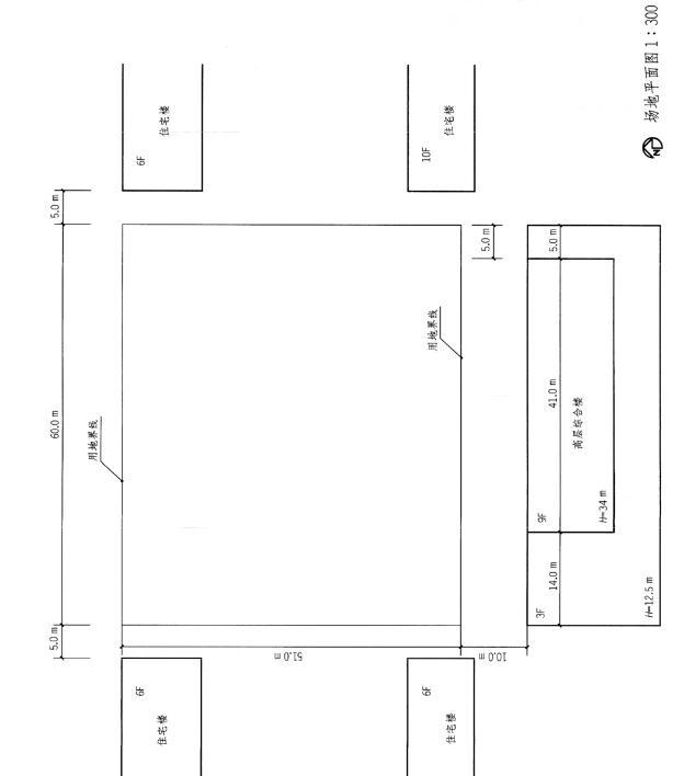 设计条件 1.某已征建设用地,拟建高层住宅楼或高层办公楼。场地东西两 侧为住宅楼,距场地5m,位置如图所示。 2.场地南侧为高层综合楼,主楼高34m,群房高12.5m。 3.拟建建筑北、东、西三面后退用地界线5m:南面如果作为高层 办公用地,则后退用地界线8m。南面如果作为高层住宅用地,则后退用地界线3m。 4.当地住宅日照间距系数为1.2。
