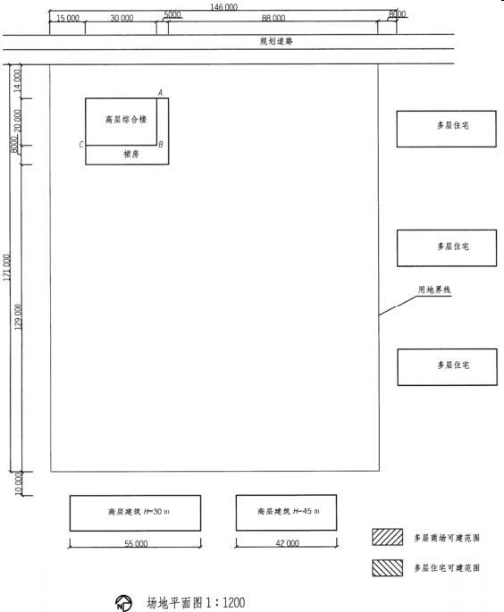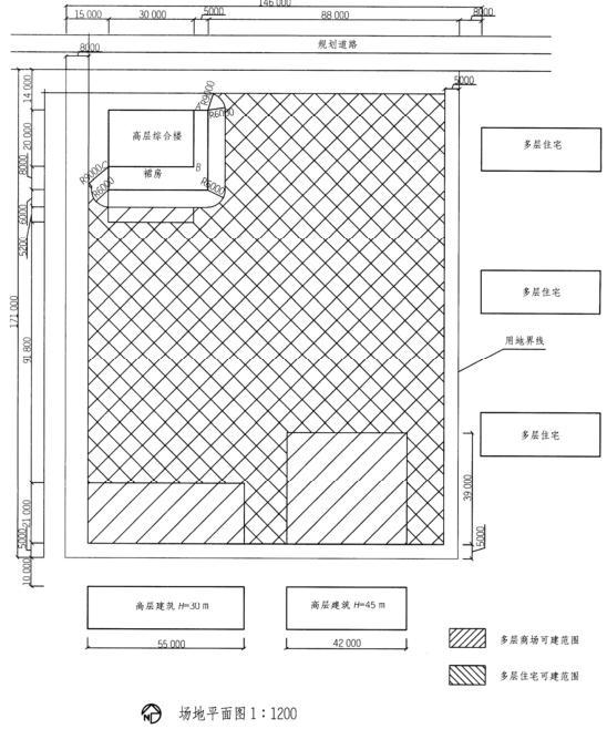 设计条件 1.某开发商有一建设用地,拟建多层住宅楼与多层商场,用地西北角已建有一栋高层综合楼,二层以上为住宅,其裙房部分为商场,高为6.2m,含女儿墙1.2m。场地南侧建有两栋高层建筑,东侧建有三栋多层住宅楼,具体条件如图。 2.拟建的住宅高为21m,多层商场高为16m。 3.当地的日照间距系数为1.2。4.拟建住宅向西、北两方向后退用地界线8m,东、南两方向后退用地界线5m。