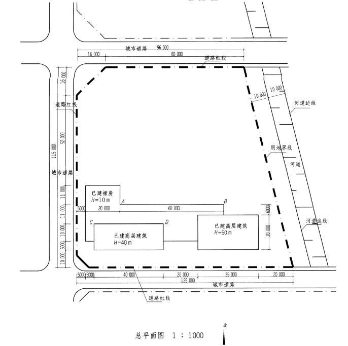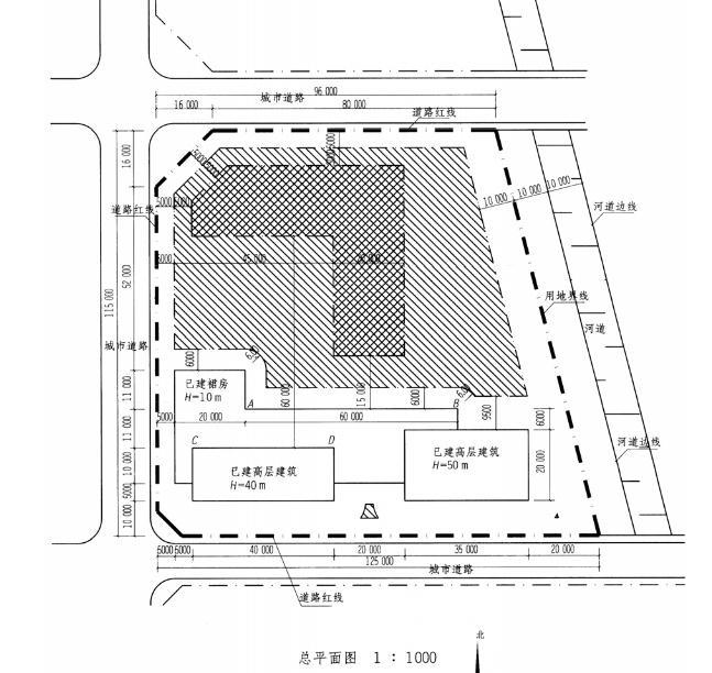 1.某建设用地内拟建高层住宅和多层商业建筑,建设用地地势平坦,用地范围现状如图所示。