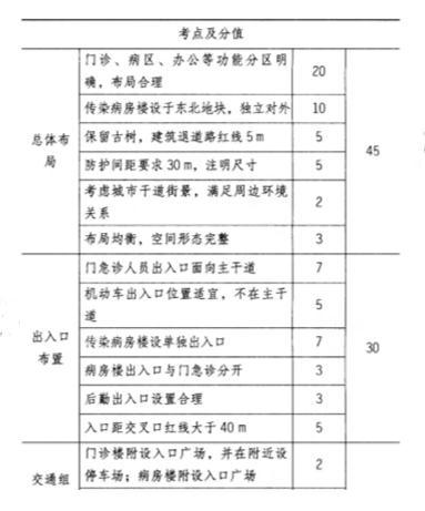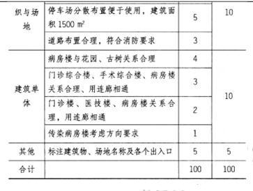 设计条件 1.某医院用地及拟建建筑平面如图所示。 2.用地中的古树需保留。 3.建筑后退用地边界5m。 4.拟建建筑面积形状及尺寸不得变动,建筑一律南北向布置,并不得旋转。 5.病房楼周围要有良好的景观环境。 6.门诊楼及病房楼要求有入口广场。 7.入口距道路红线交点不小于40m。 8.停车场1500m,可分散布置。 9.门诊综合楼、病房楼、手术综合楼、医技楼以及科研办公楼之间需采用连廊连接,连廊按5m宽设置,长短可按需要设置。 10.当地日照间距系数1.2。