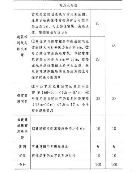 2.分析用地南侧已建住宅对拟建住宅可建范围的影响:a.防火间距满足要求;b.日照间距,⑤号已建住宅高68m,减去裙房高度10m,拟建住宅的日照间距需要87m,在用地范围内不能再建住宅;而⑥号住宅其实对拟建住宅的日照并没有影响,因为拟建住宅在10m裙房上面,其可建范围南边界距离南侧已建住宅北外墙应为1.5×(18m-10m)=12m,小于规划退线要求。
