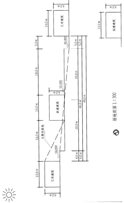 设计条件 1.某坡地已建有两栋建筑,南面建筑与北面建筑之间的间距是49m,其中坡地剖面如图所示。 拟在两栋已有建筑之间加建一栋新建筑,三栋建筑均为6m高。场地之间采用挡土墙分成三级水平台地。 2.要求通过一次挖方和填方确定新建建筑场地标高,并达到土方平衡。 3.要求新建建筑离南面建筑的距离最小。 4.日照间距系数为2.0。