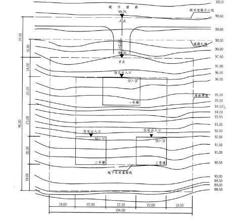 某坡地上布置五层住宅3栋,并附建共用的一层地下车库,如图所示。