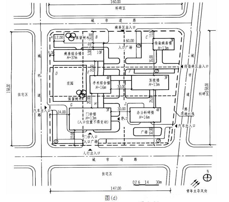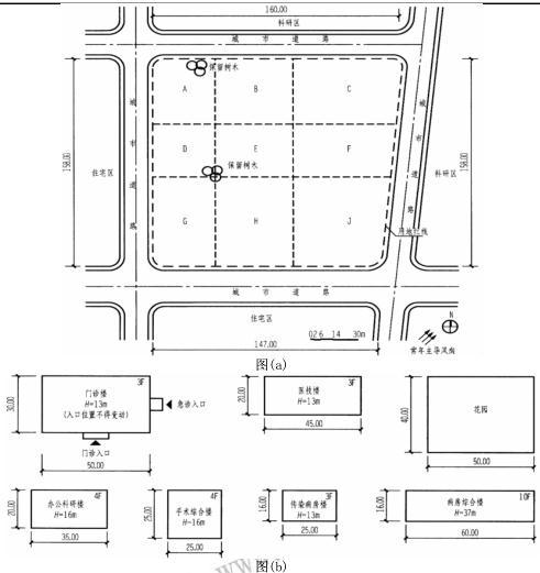 ·拟在一平坦用地上建一座300床综合医院,其用地及周边环境[图(a)],建设内容如下。