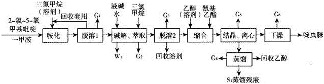 拟在现有厂区新建农药啶虫脒生产项目,建设内容包括:新建胺化缩合车间,干燥车间,扩建化学品罐区。生产工艺流程见图6-1。主要原料有2-氯-5-氯甲基吡啶、一甲胺和氰基乙酯,主要溶剂有三氯甲烷、乙醇。拟在现有化学品罐区内增设化学品储罐,包括2×80m3乙醇常压储罐、10m3一甲胺压力储罐和2×30m3三氯甲烷常压储罐,贮存量分别为100t、4t和50t。