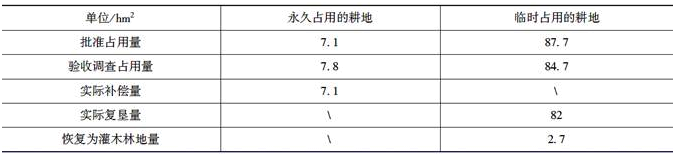 竣工环境保护验收调查单位当年8月进行调查,基本情况如下:项目建设过程中实施了工程环境监理,临时占用耕地大部分进行了复垦,其余耕地恢复为灌木林地。对批准永久占用的耕地进行了占补平衡,有关耕地的调查情况见表8-1。管道穿越林区4km线段,占用林地7.1hm2,采用当地物种灌草结合对施工作业段进行了植被恢复,植被覆盖率20%,有5km管道线路段发生了变更,主要占地类型由原来的林地变为园地和其他土地。