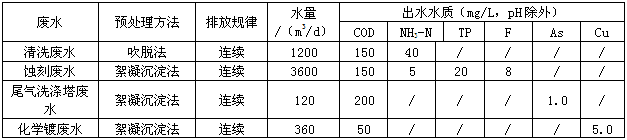 生产过程中产生的清洗废水、蚀刻废水、尾气洗涤塔废水、化学镀废水经预处理后进最终中和池,最终中和池出水排入园区污水处理厂。废水预处理后的情况见表5-1。